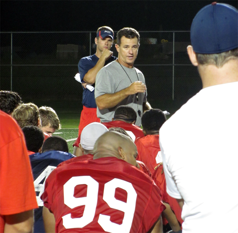 Head Coach Joey Jones speaks to his team after the conclusion of the Jaguars first practice of 2012 preseason camp.