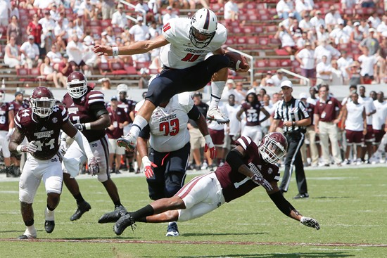Sophomore Dallas Davis hurdles a Mississippi State player on the Jaguars final drive in their 21-20 defeat of the Bulldogs in Starkville, MS. | Photo by: Bobby McDuffie usajaguars.com