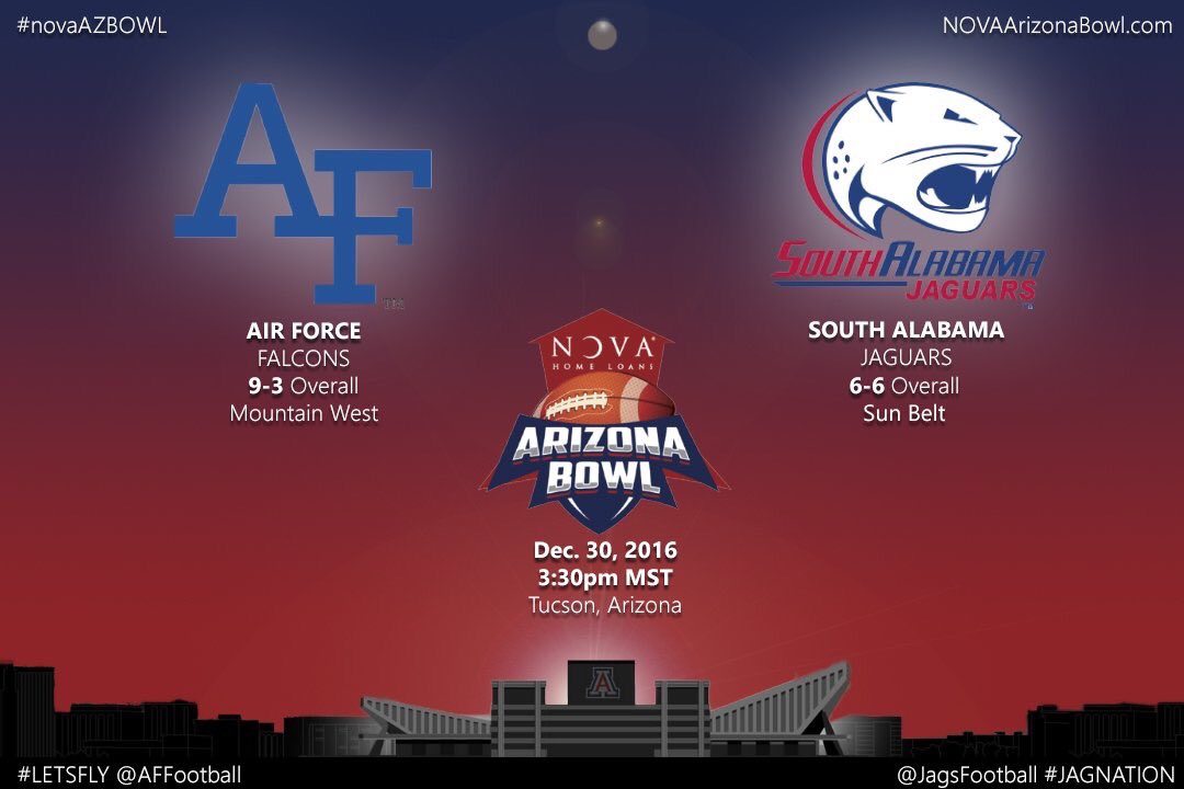 South Alabama will face off against the Air Force Academy Falcons on Friday, December 30th at 3:30 MST (4:30pm CST) in the 2016 Nova Home Loans Arizona Bowl.