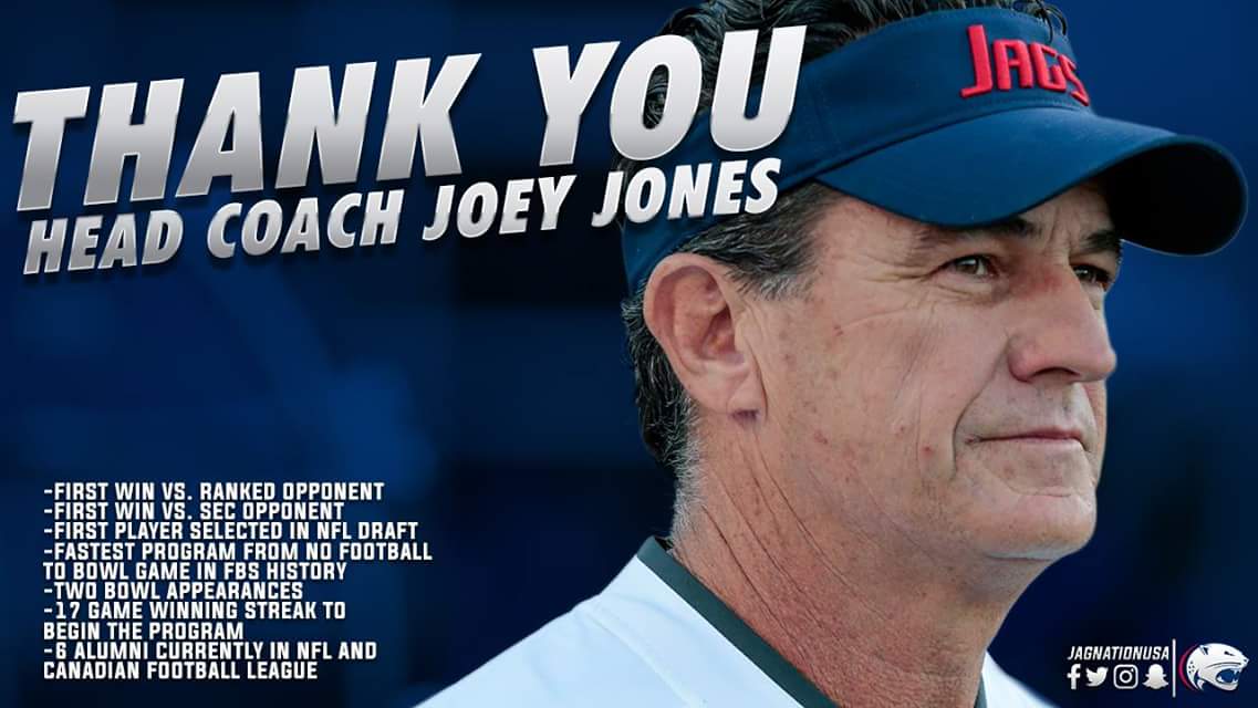 Thank you coach Jones, your work has built the South Alabama program from scratch to what it is today. Photo Credit: JagNationUSA Facebook Page