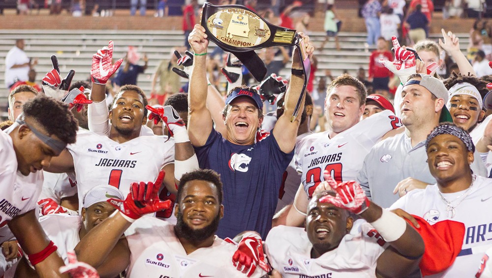 Head coach Joey Jones lifts the ‘Battle for the Belt’ championship belt for the third time in the last four years. | Photo Credit: Brad Puckett usajaguars.com