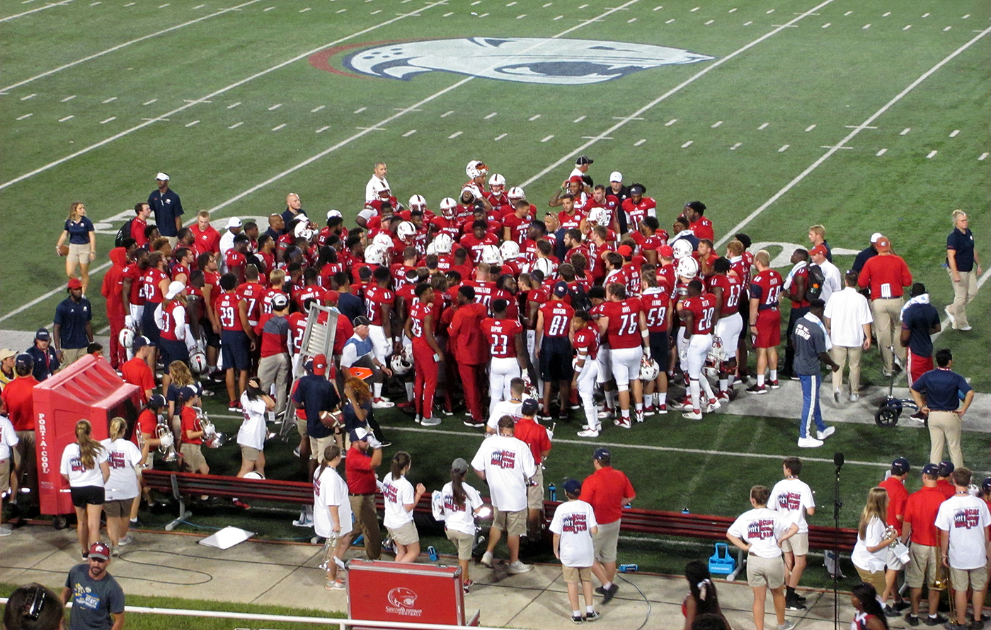 Head coach Steve Campbell huddles his team on the field before going to the locker room for halftime trailing Texas State 24-16. South Alabama would go on to win 41-31.