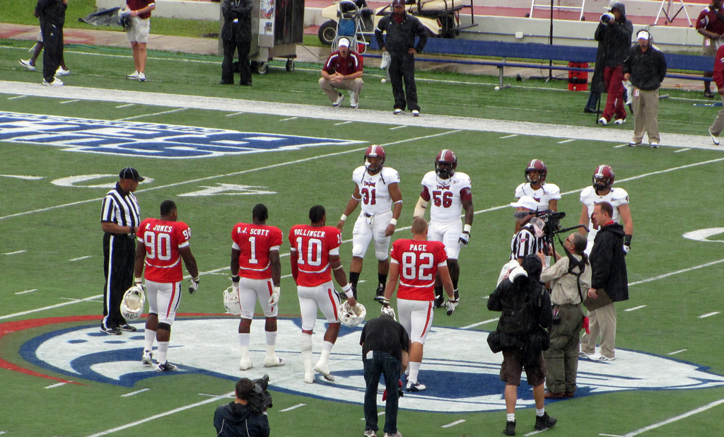 Game Captains for South Alabama Romelle Jones, B.J. Scott, Greg Hollinger and Alex Page meet the Troy captains at mid-field for the coin toss in the two teams first meeting and the Jaguars first Sun Belt Conference game.